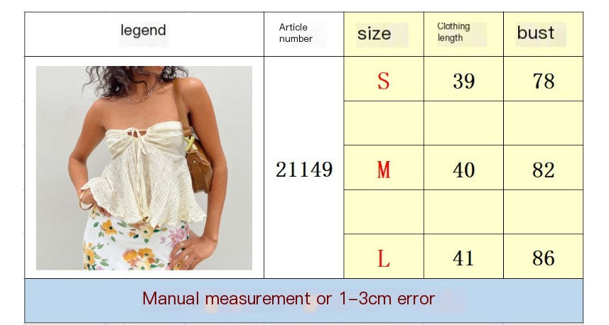 This off-shoulder ruched tube top features a front tie-up and delicate ruffle detailing, creating a playful and flattering silhouette. Made from soft polyester, it offers comfort and stretch while maintaining a chic look. Ideal for parties, clubbing, or casual summer outings, this mini vest brings effortless style to any occasion.