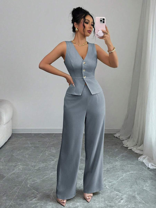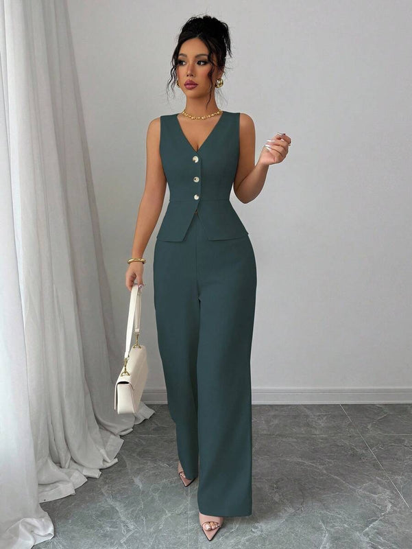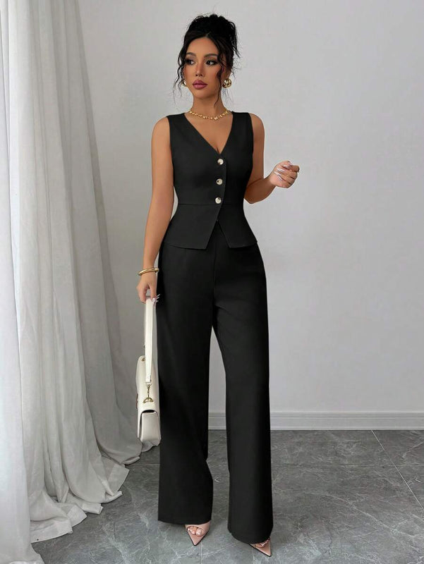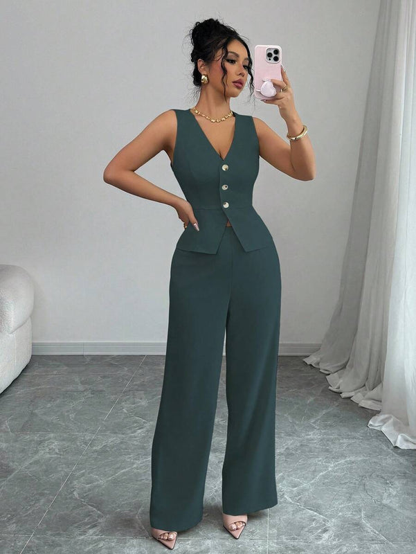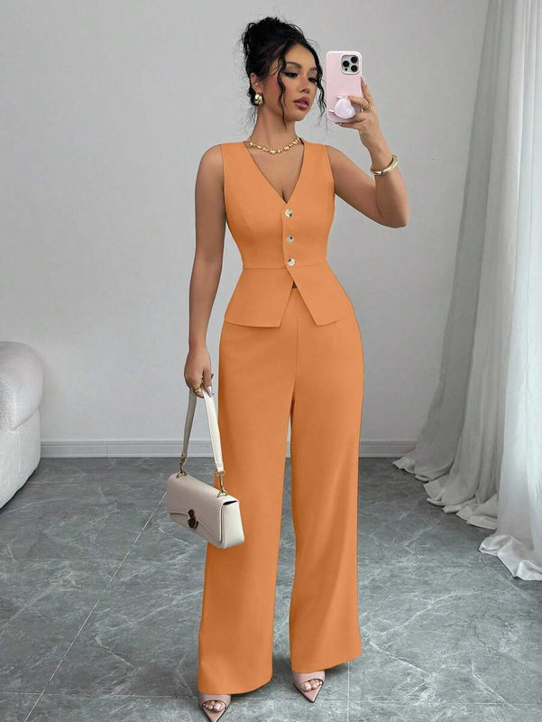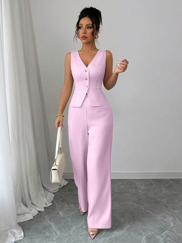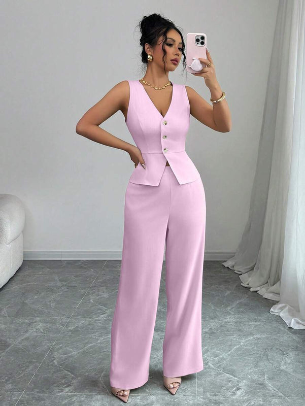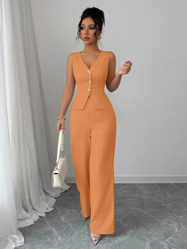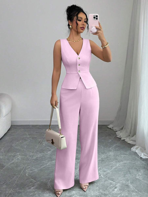 ✔️ Design: V-neck camisole with button-front detail + slim-fit pants