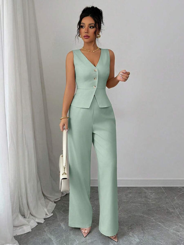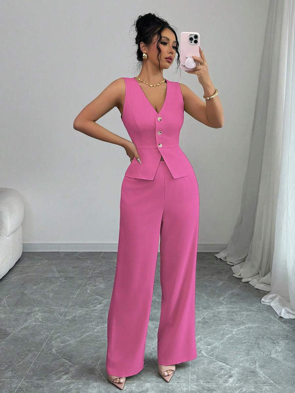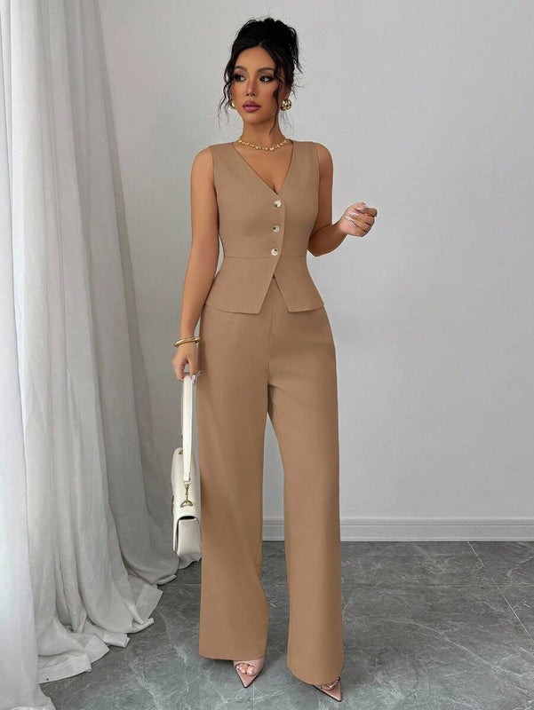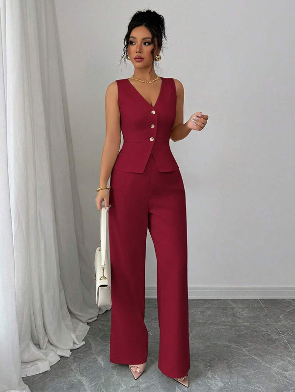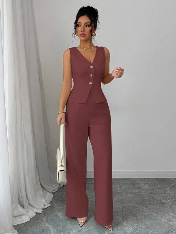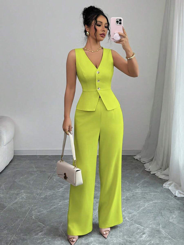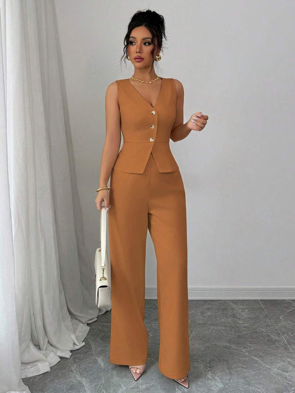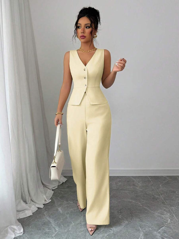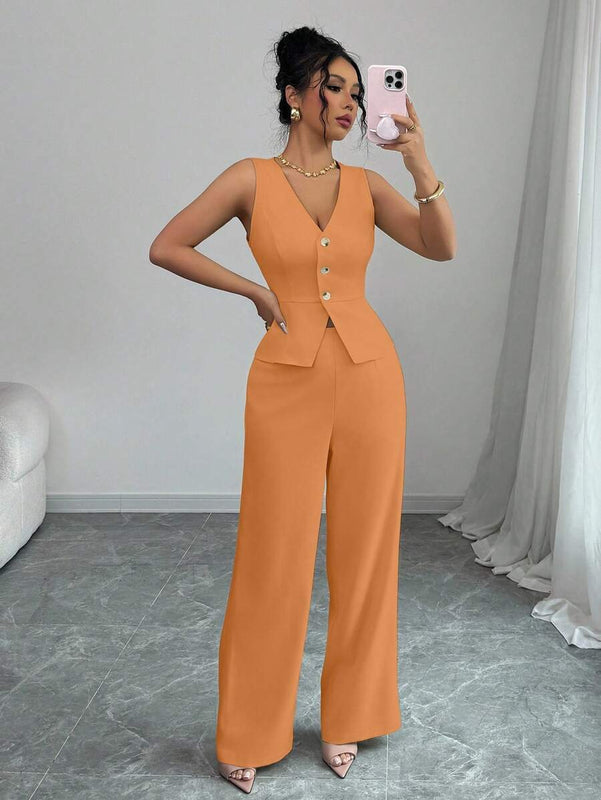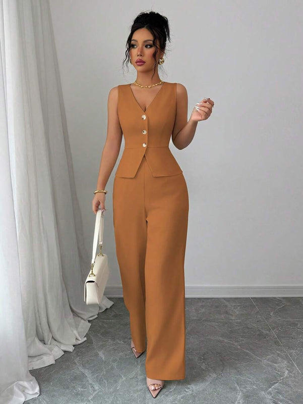 ✔️ Design: V-neck camisole with button-front detail + slim-fit pants