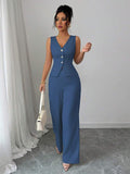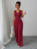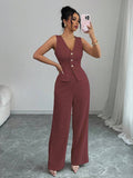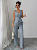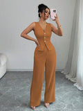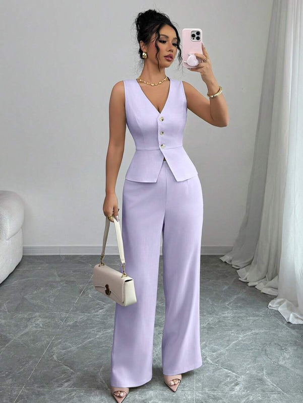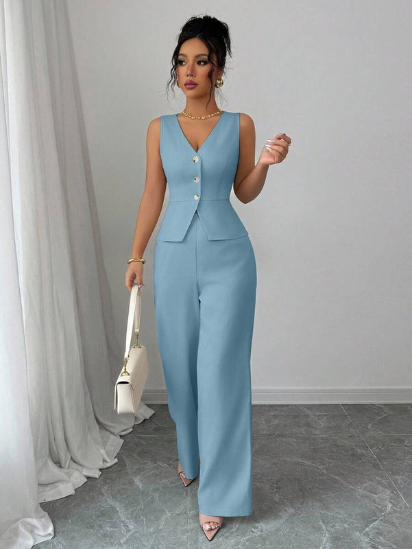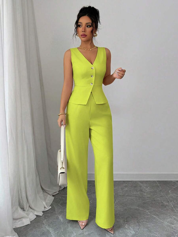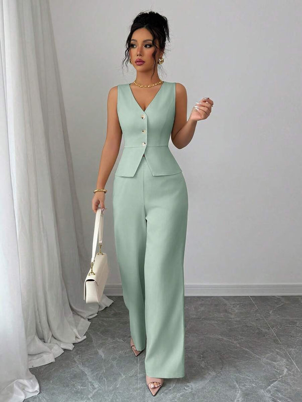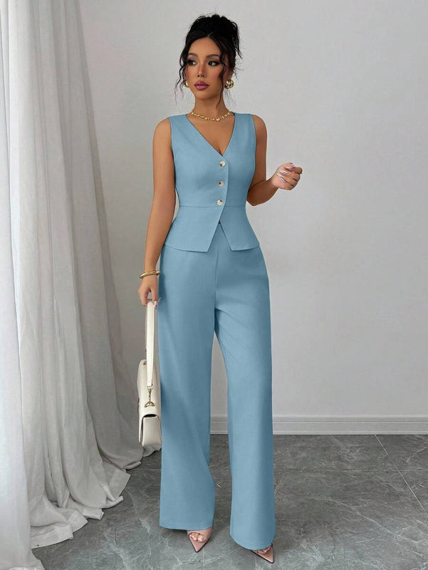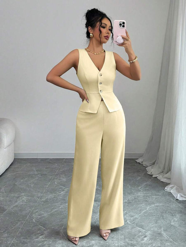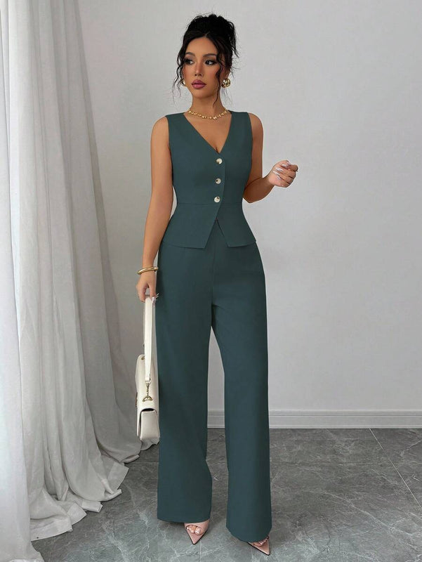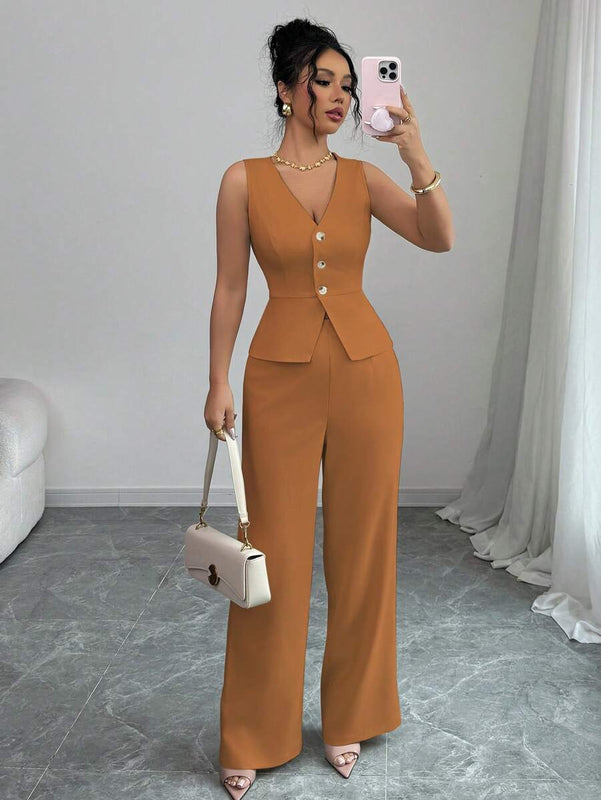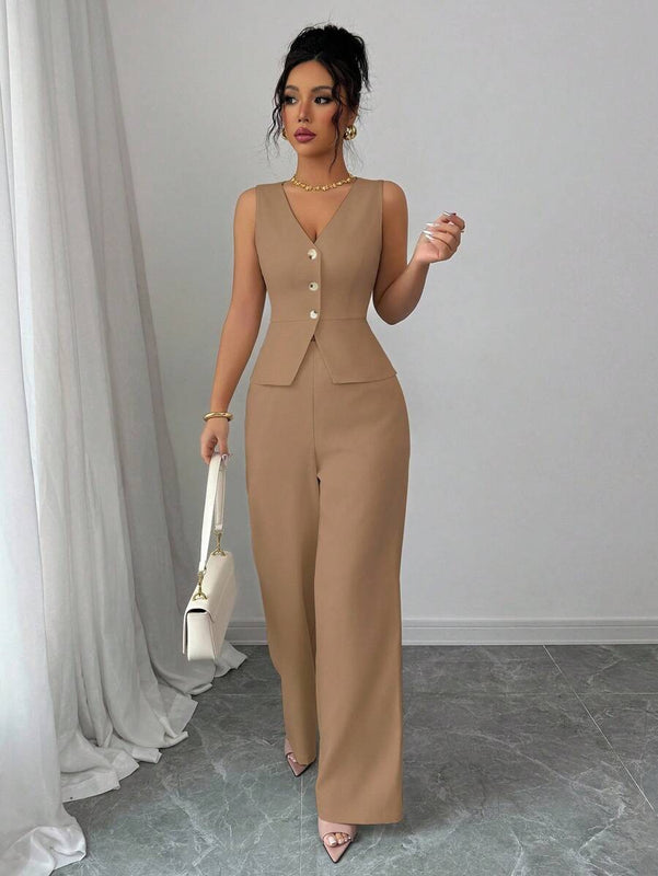 ✔️ Design: V-neck camisole with button-front detail + slim-fit pants