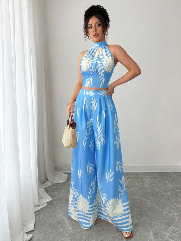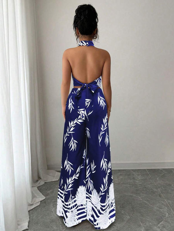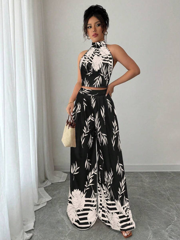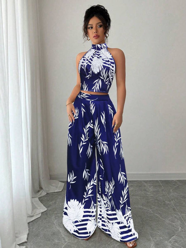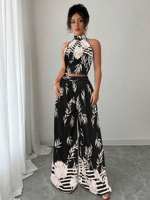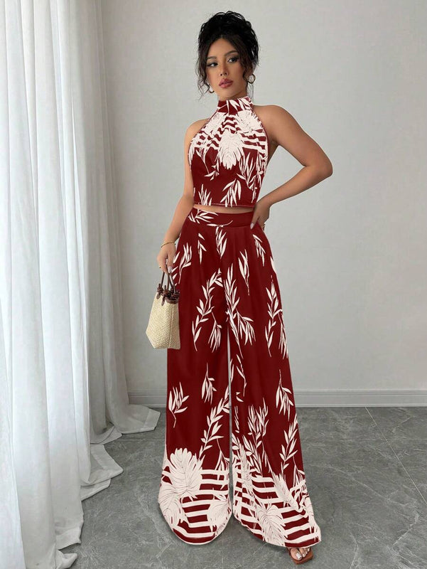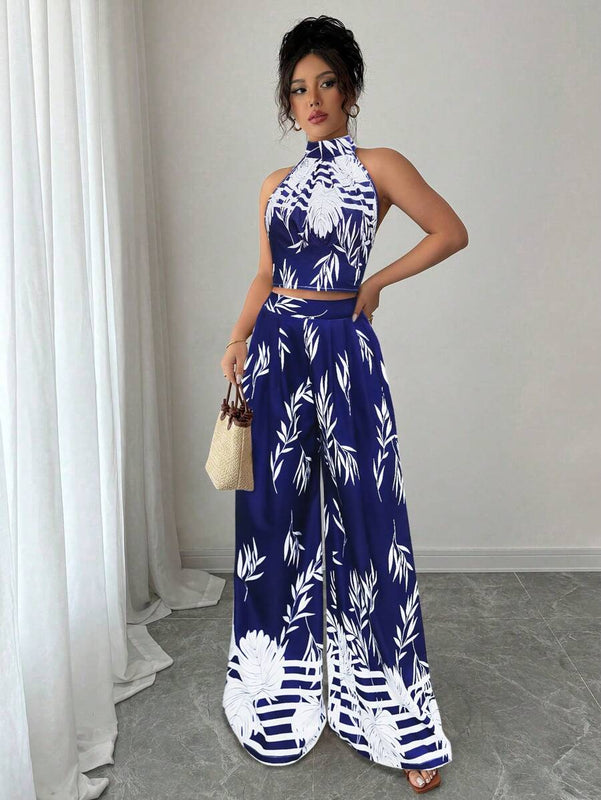 ✔️ Design: Halter neck crop top with backless tie + flowy wide-leg pants