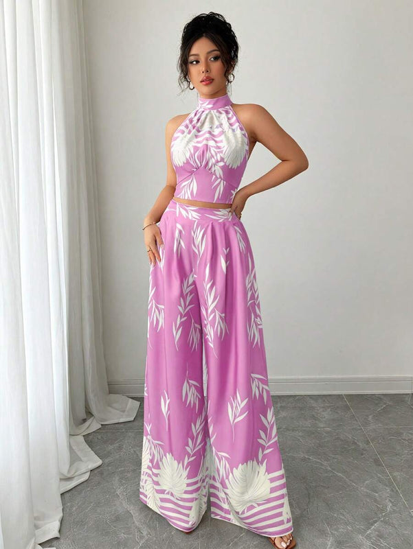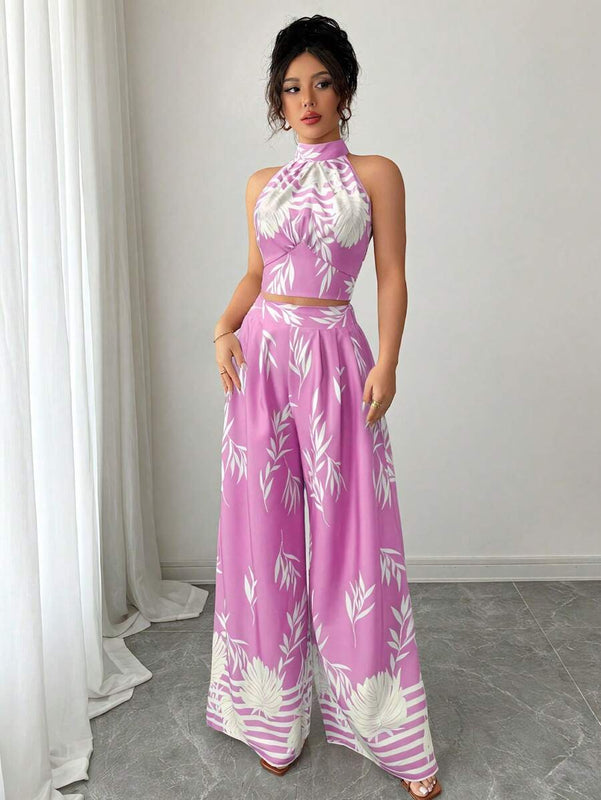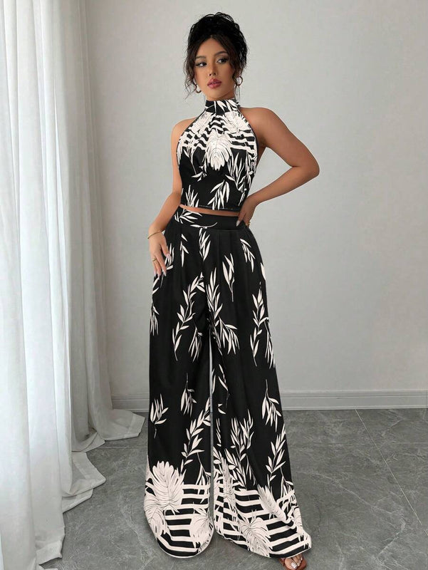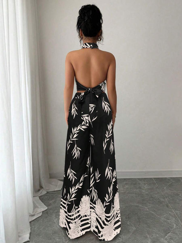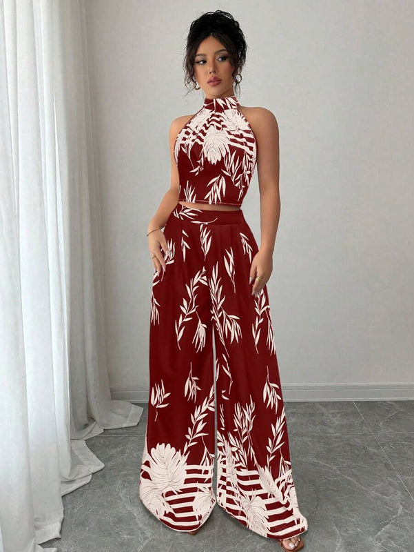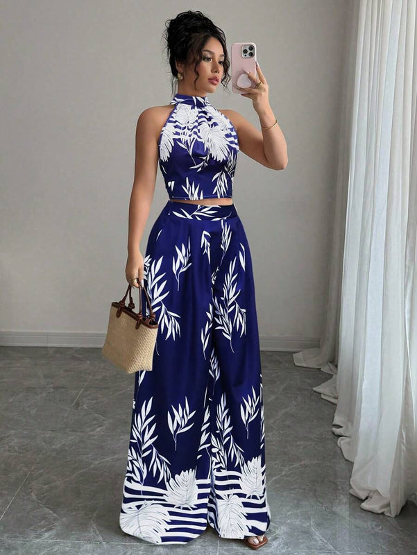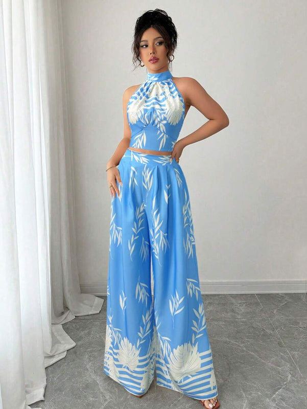 ✔️ Design: Halter neck crop top with backless tie + flowy wide-leg pants