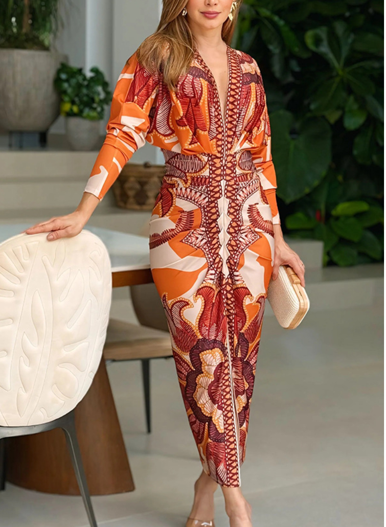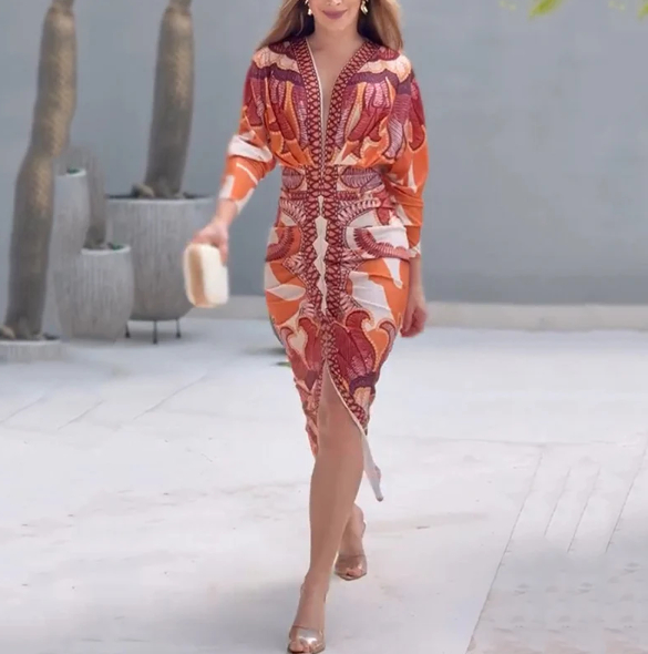 🔥 Printed Midi Dress with Long Sleeves and Slit - Elegance and Power
