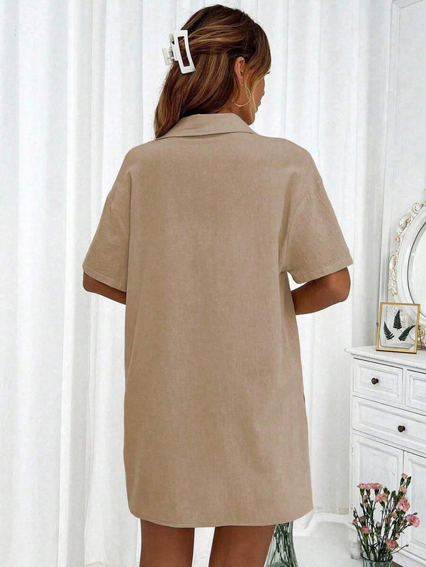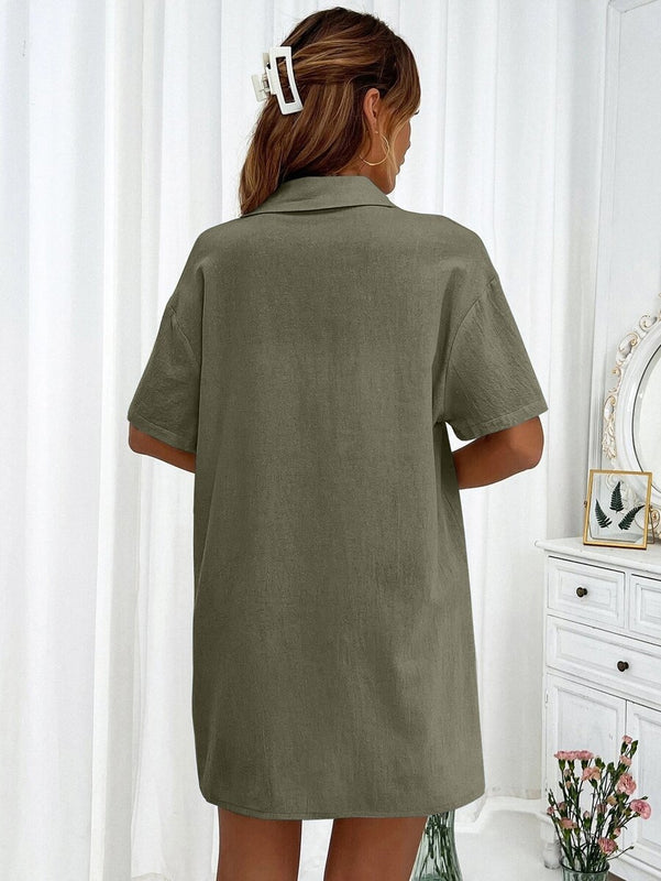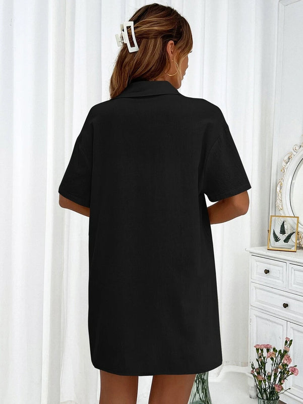 ✓ Shirt: Drop-shoulder, collared, button-down, short sleeve, regular length
