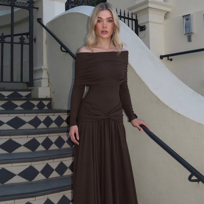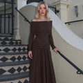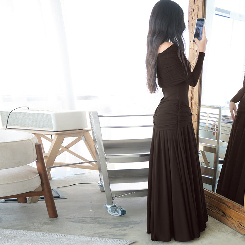 Off-Shoulder Cinched Pleated Dress – Elegant Long Sleeve Asymmetric Midi Dress