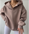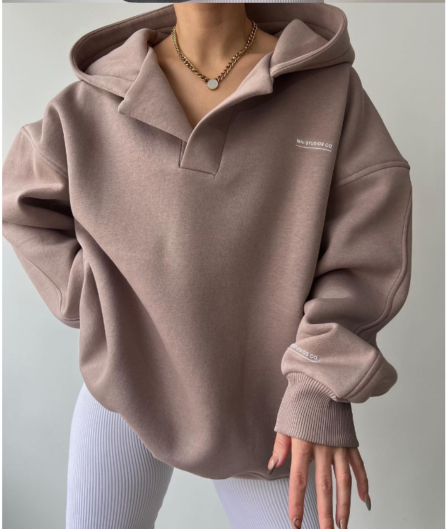 This oversized sweatshirt is the perfect choice for those looking for a stripped-down, modern and extremely comfortable look. With a loose fit, it offers freedom of movement and a lot of style. The open V-neck design adds a distinctive touch, while the hood reinforces the casual urban style. Minimalist white details on the cuffs and chest give the garment a subtle charm.