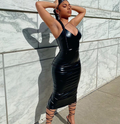 Brown midi dress in synthetic leather, with thin straps and a deep neckline that enhances the neck with sophistication. The fitted shape highlights the curves impeccably, creating a powerful silhouette.