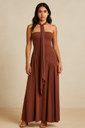Long Brown Halter Dress with Neck Tie - Elegant and Versatile Look