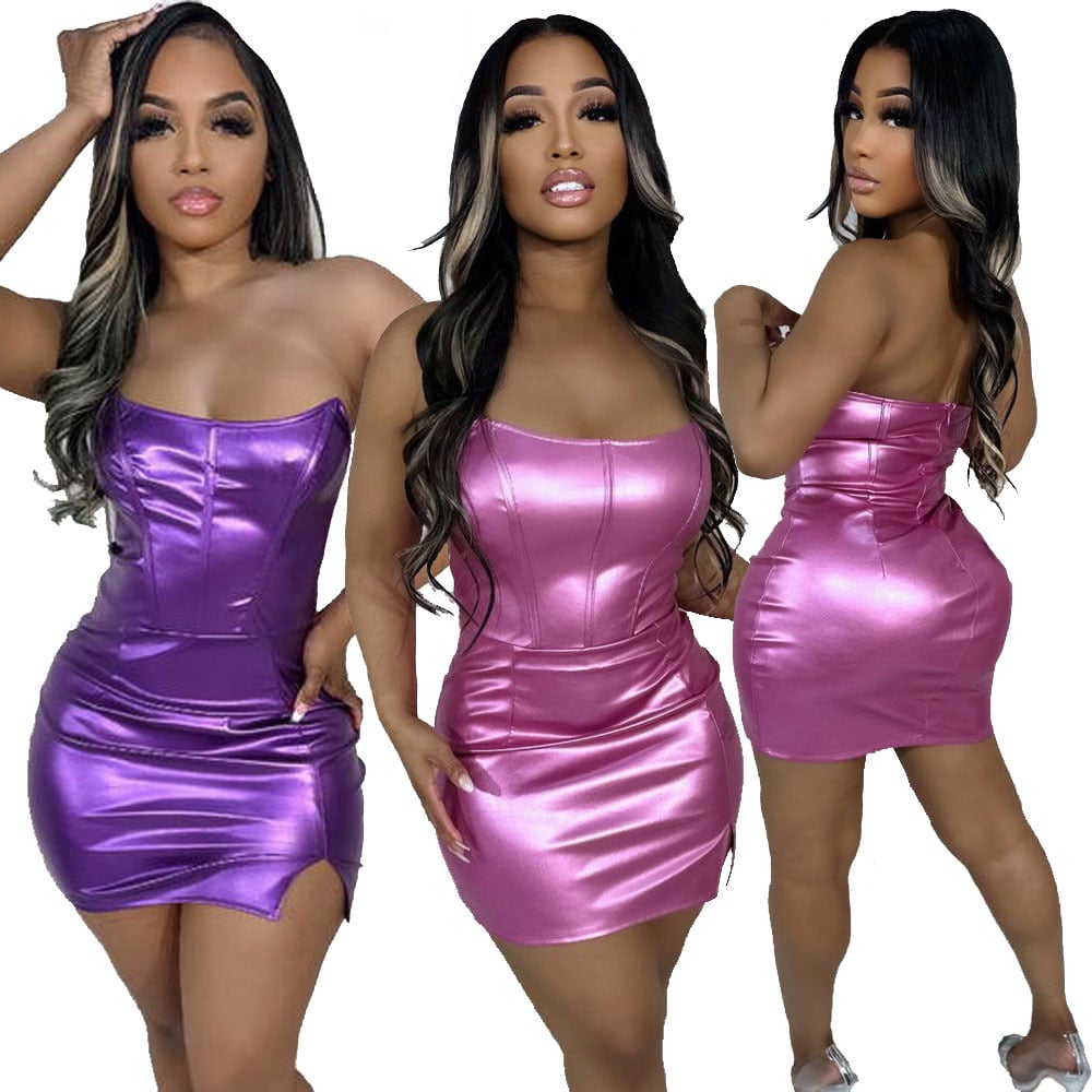 Made for those who love to stand out, this vinyl strapless dress offers a powerful and sensual look. With a shiny finish in purple and metallic pink, the piece enhances your curves with its tight fit and strategic cut-outs. The side slit detail adds even more daring to the look, ideal for parties, ballads or evening events full of attitude.
