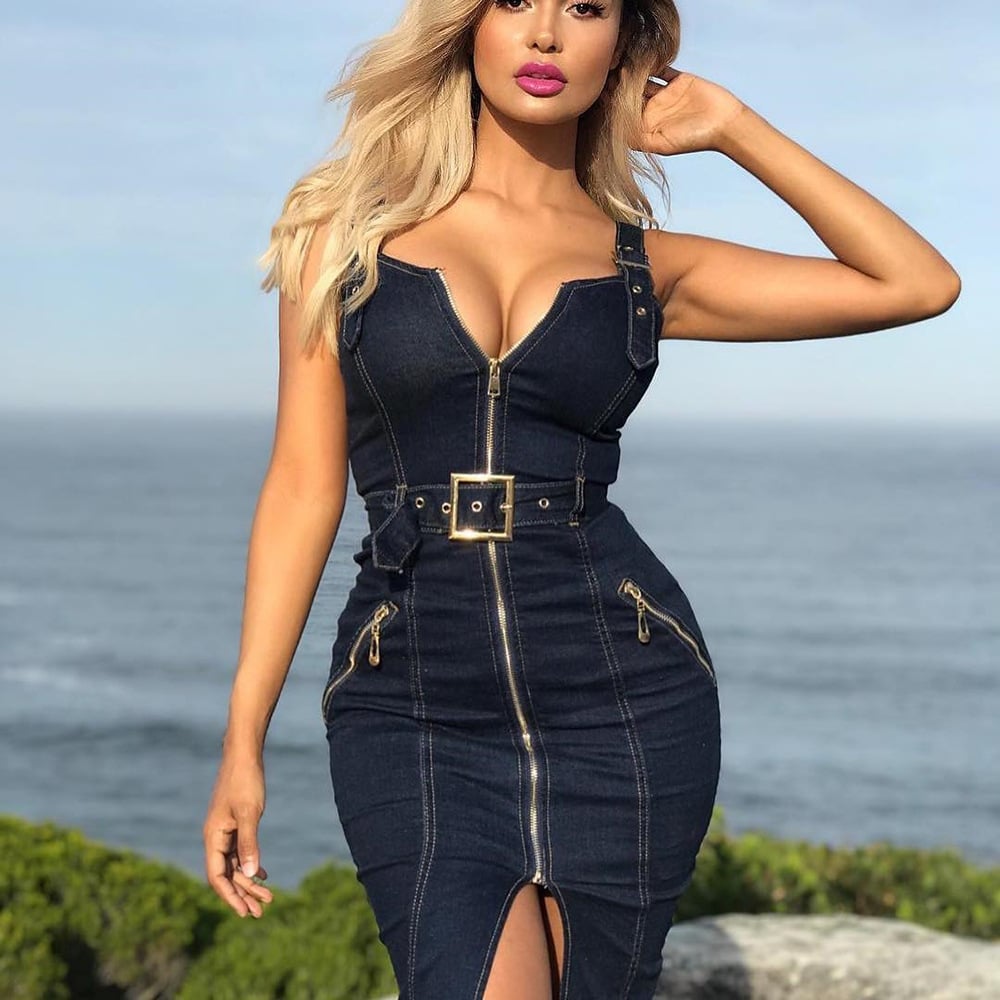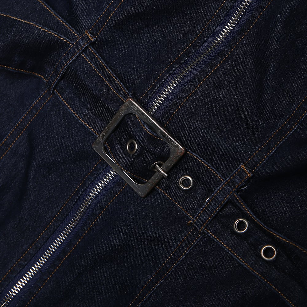 Denim belt with gold buckle, marking the waist and slimming the silhouette