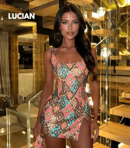 Go for a striking look with this short party dress with sequins, ideal for glamorous evenings, ballads and special occasions. Fitted to the body, with a single strap and a generous neckline, the dress enhances your curves with sensuality and style. Multicolored sequins in a geometric pattern create a vibrant and modern look, while the side slit adds a daring touch to the design.