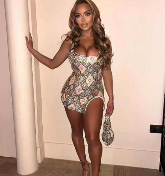 Sparkly Short Dress with Multicolored Sequins and Side Slit