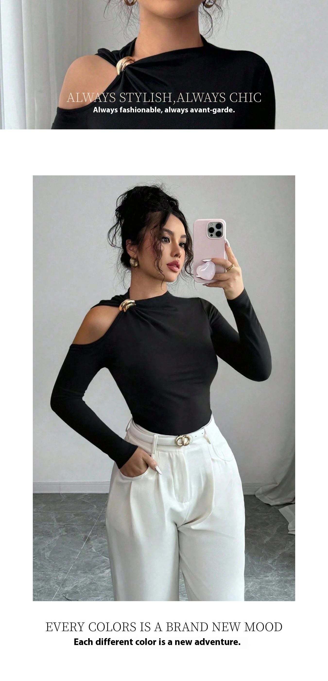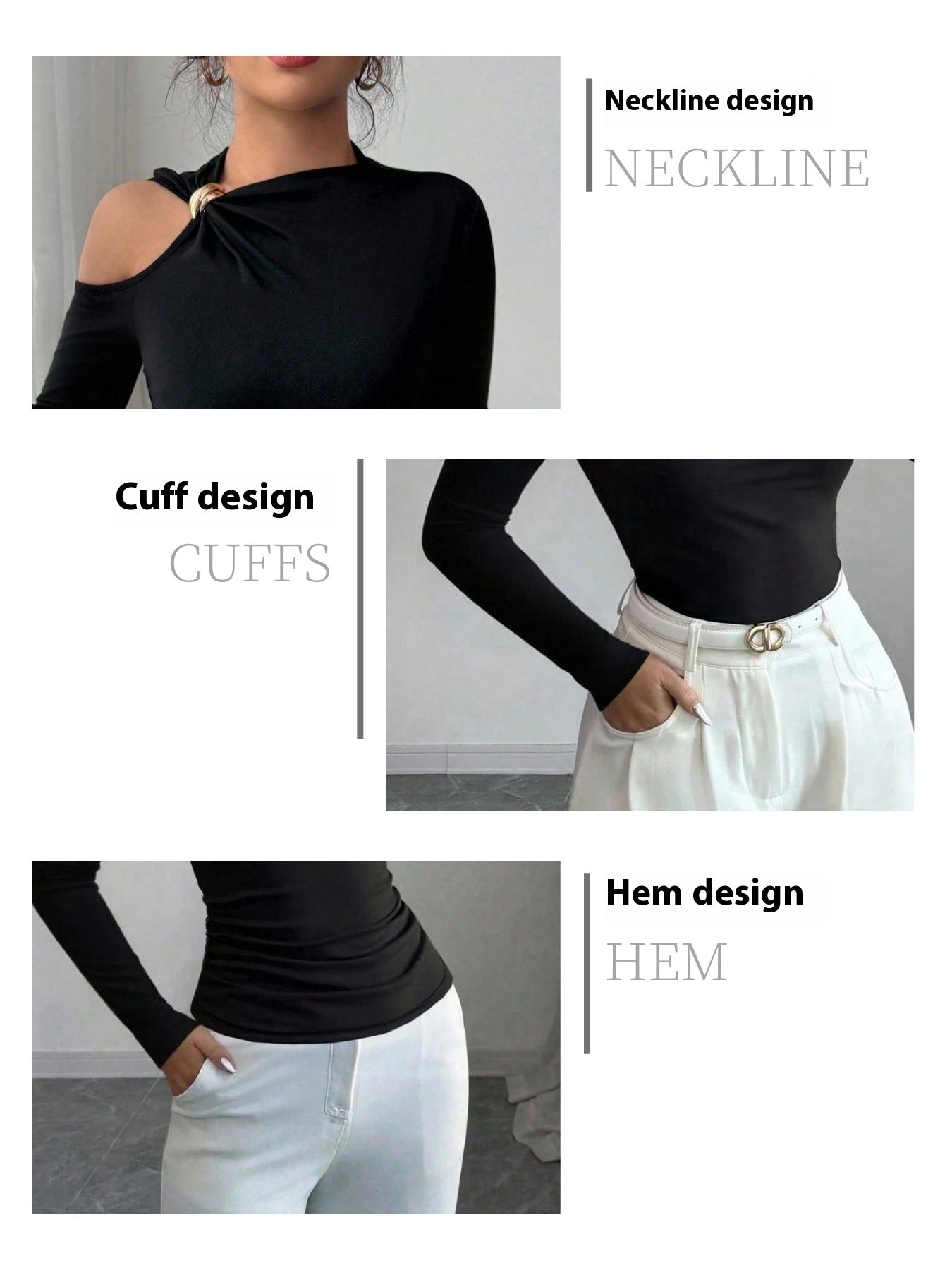 ✔️ Design: Asymmetric one-shoulder neckline with metal detail