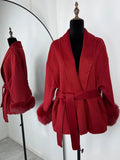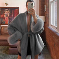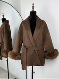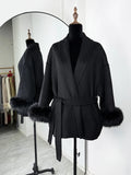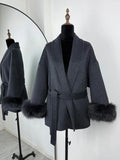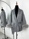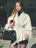 Women’s Fur V-Neck Lace-Up Woolen Coat – French Elegance