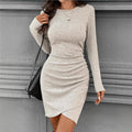 This long-sleeve bodycon dress is designed with a sleek turtleneck and a pleated waist that enhances your natural curves. Made from soft polyester, it offers a comfortable fit while maintaining a polished, form-fitting look. Perfect for work, evening outings, or special occasions, this mid-length dress blends modern sophistication with timeless style.