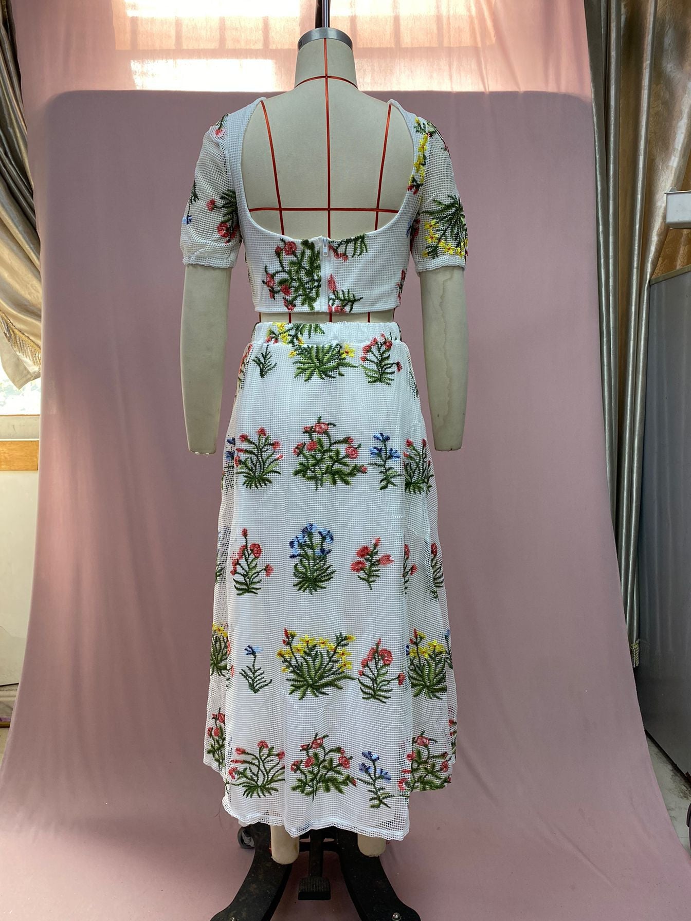 Women's Backless Embroidered Two-Piece Set – Fitted Waist Top & Floral Mid-Length Skirt