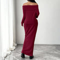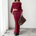 Women's Off-Shoulder Knitted Two-Piece Set – Wine Red Top & Long Skirt
